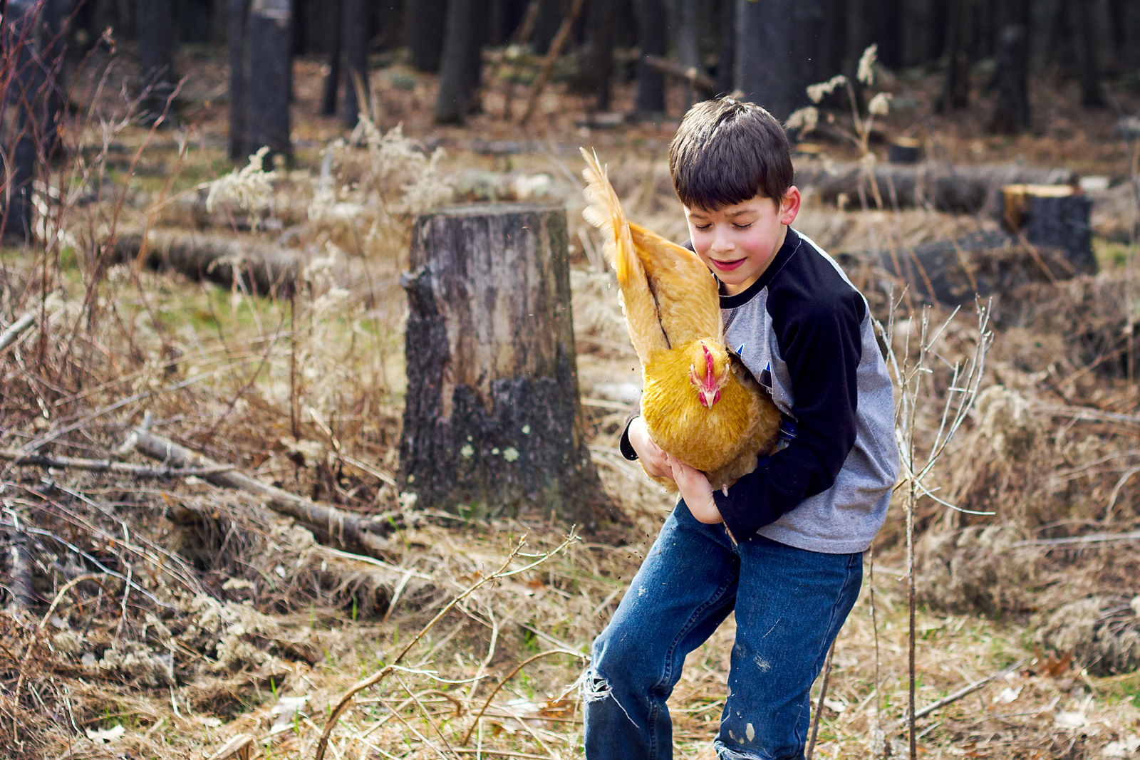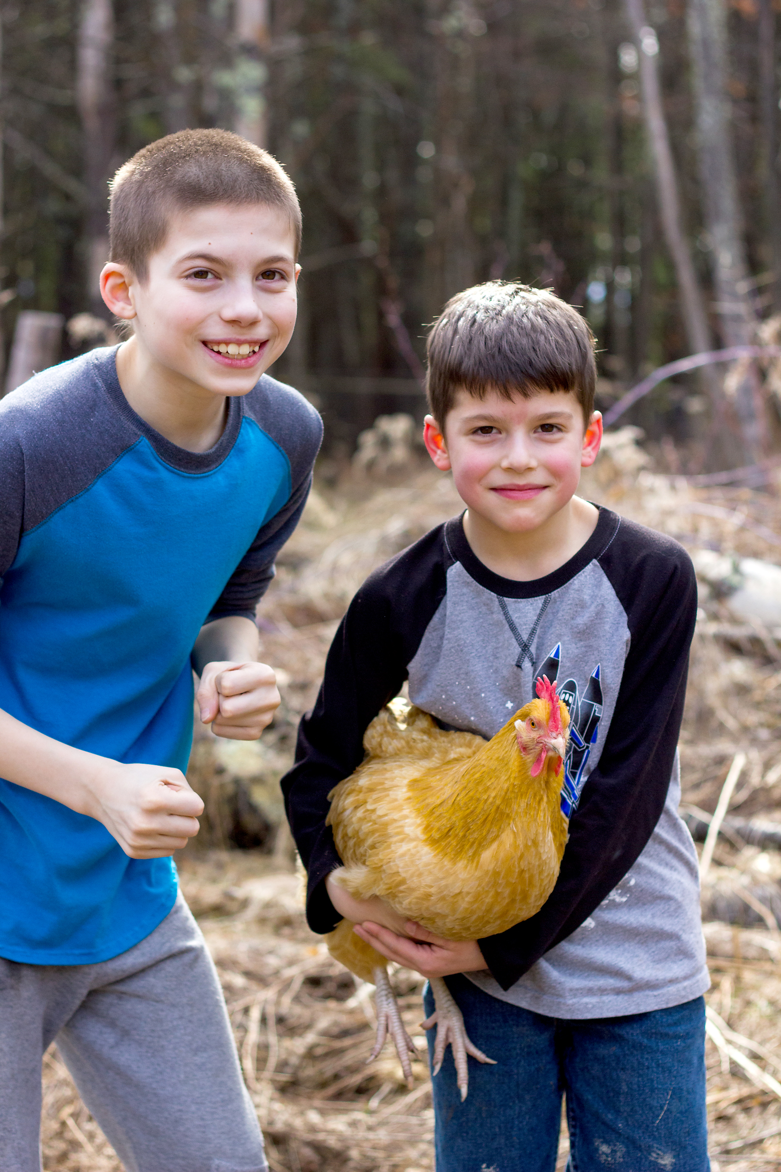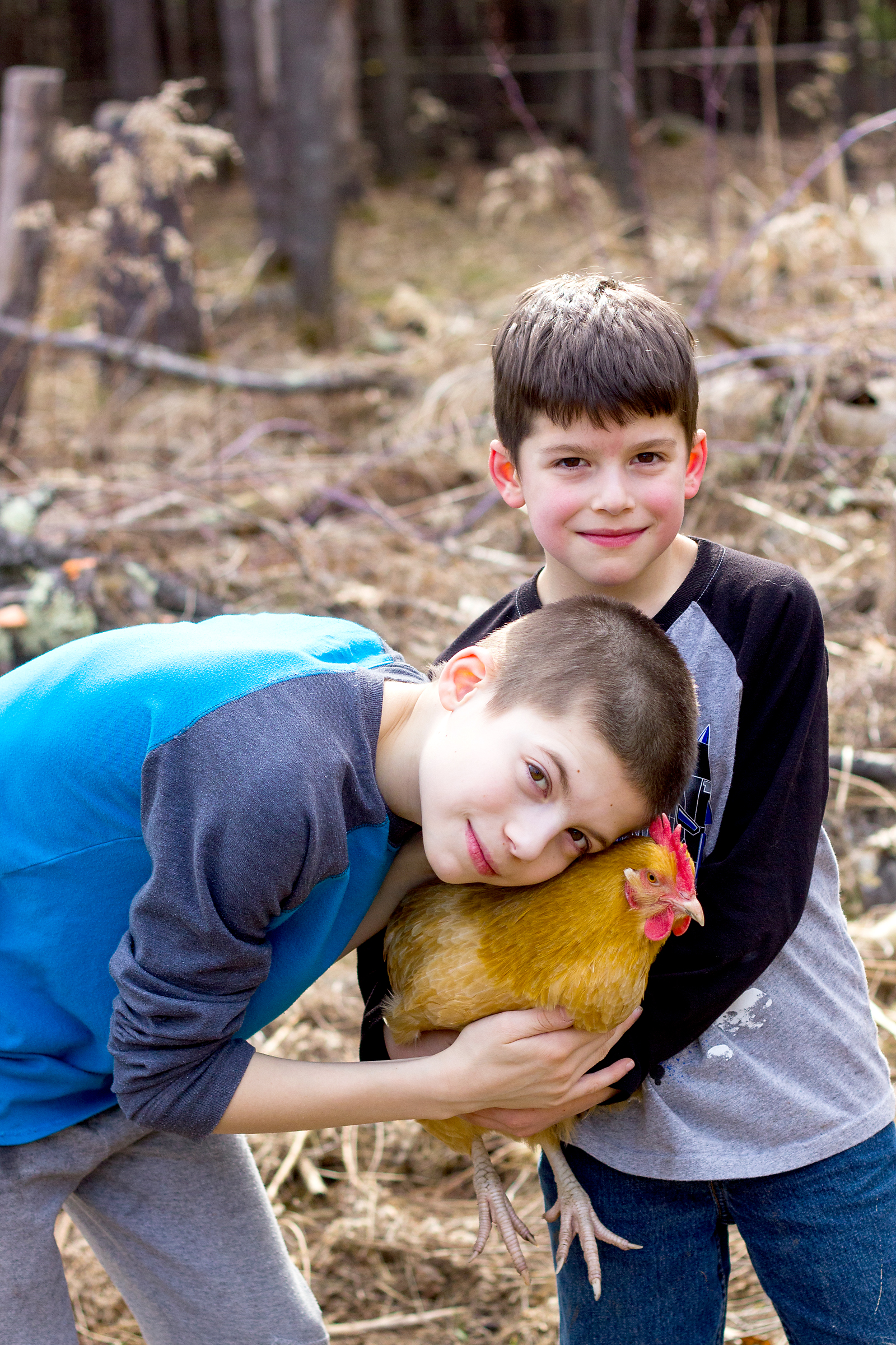 It’s been really quiet on the blog. The long, dark and cold winter put me in a photography rut. But spring is here and we can finally go outside again. The chickens are enjoying it just as much as the kids. And I enjoy capturing our “real” life – messy yard, kids with torn pants and paint stains and most likely chicken poop. I was just trying to take a few photos of the kids hanging with the chickens dust bathing. It was their idea to do a little shoot with Goldie, the only chicken that likes to be picked up.