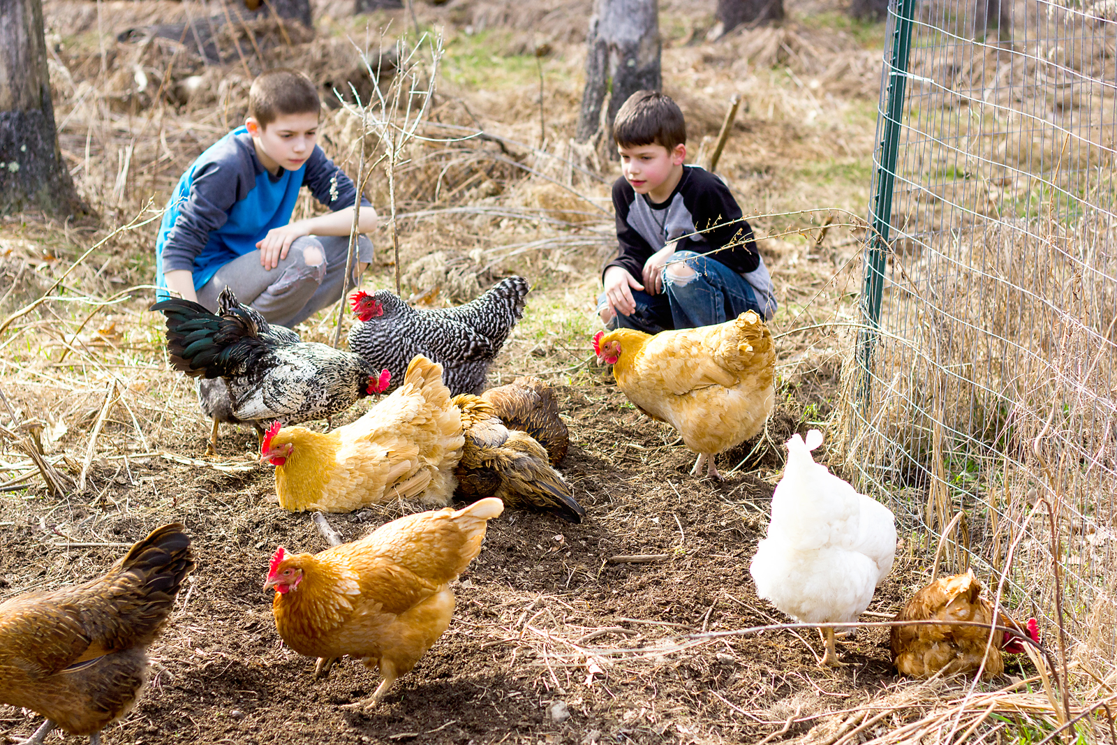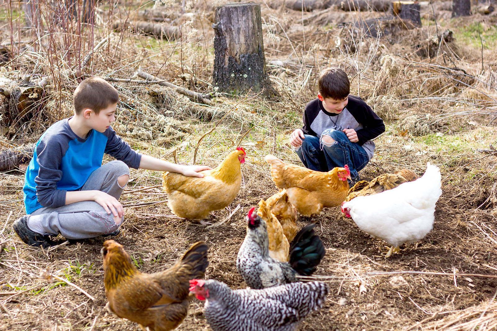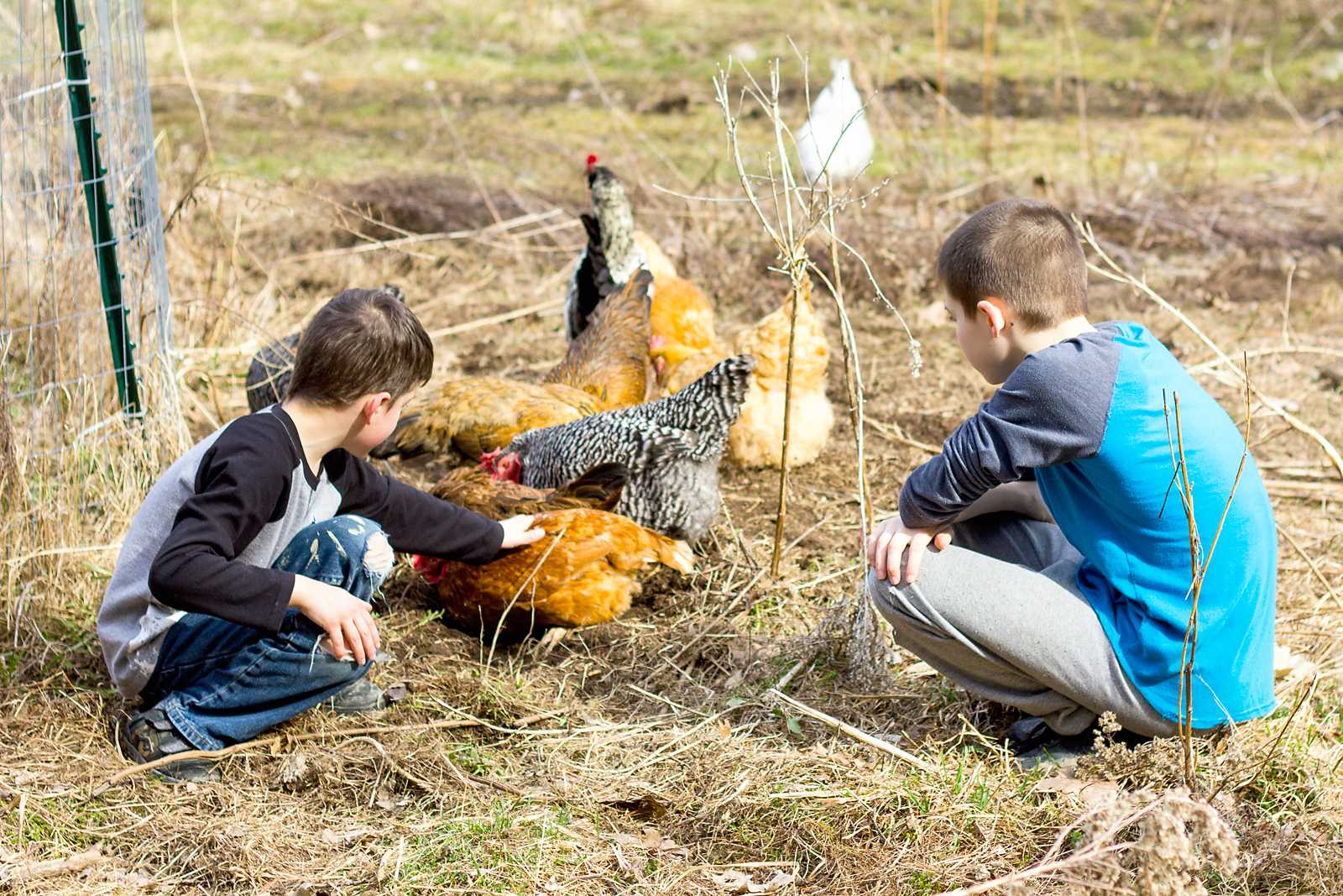 It’s been really quiet on the blog. The long, dark and cold winter put me in a photography rut. But spring is here and we can finally go outside again. The chickens are enjoying it just as much as the kids. And I enjoy capturing our “real” life – messy yard, kids with torn pants and paint stains and most likely chicken poop. I was just trying to take a few photos of the kids hanging with the chickens dust bathing. It was their idea to do a little shoot with Goldie, the only chicken that likes to be picked up.